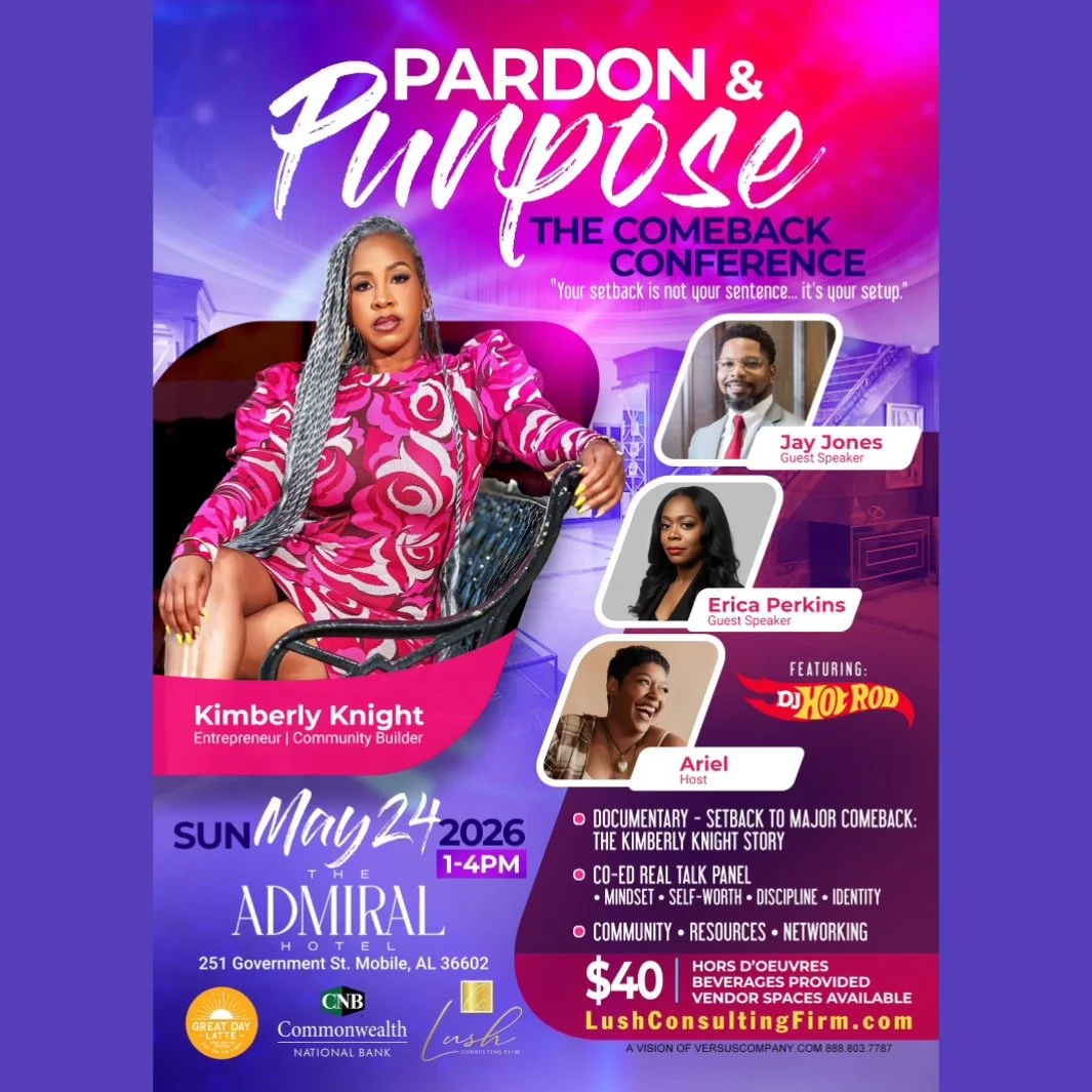 The "Pardon & Purpose: The Comeback Conference" will be held at The Admiral Hotel, May 24, 2026, in Mobile, AL from 5:00 PM to 8:00 PM in Downtown Mobile, AL.